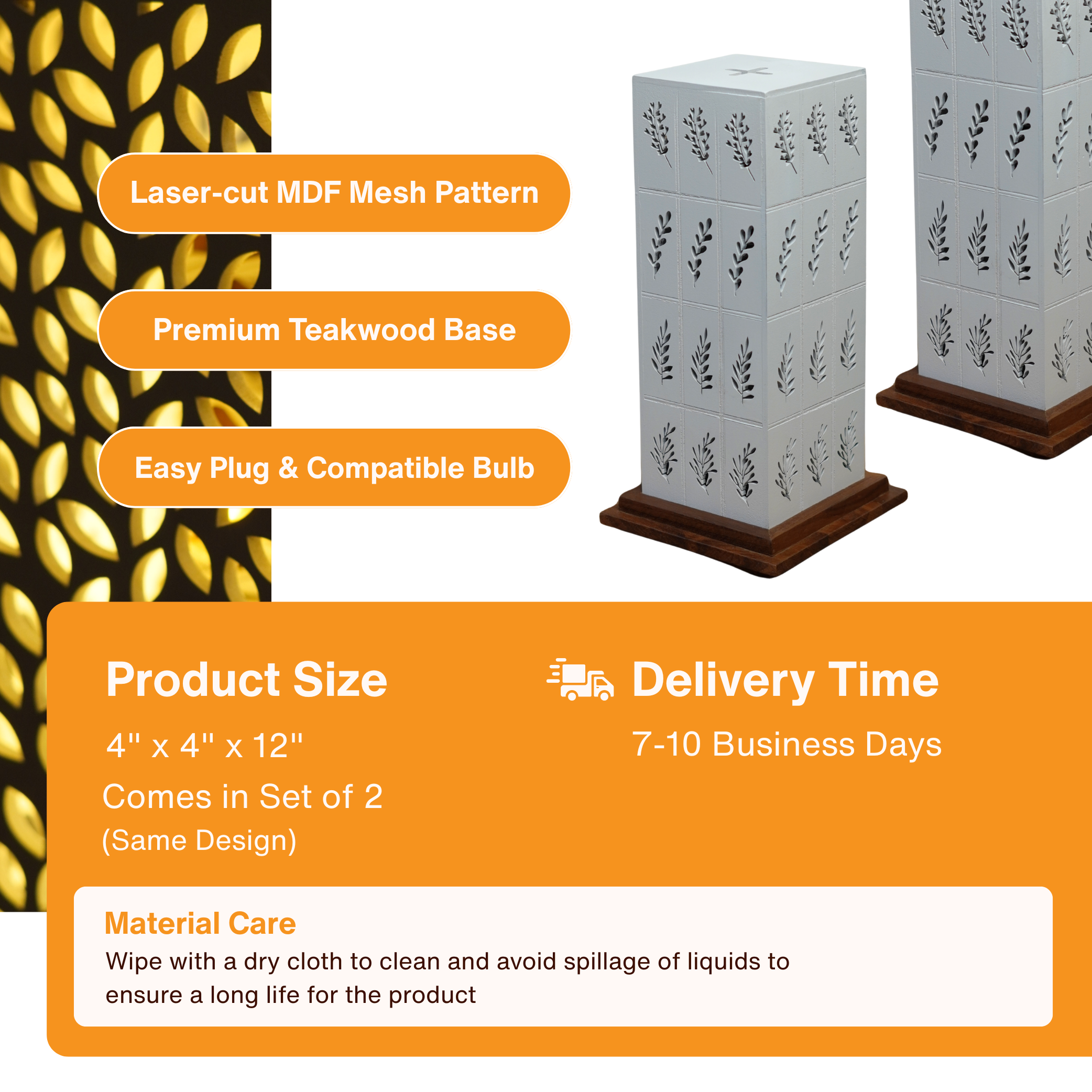 Add warmth and nostalgia to your space with our set of two Bedside Lamps. Featuring a premium teak wood base and kaleidoscopic laser-cut MDF mesh design, they blend elegance with function. Complete with bulbs and fittings, they’re ready to light up your home—The Artiqulate way!